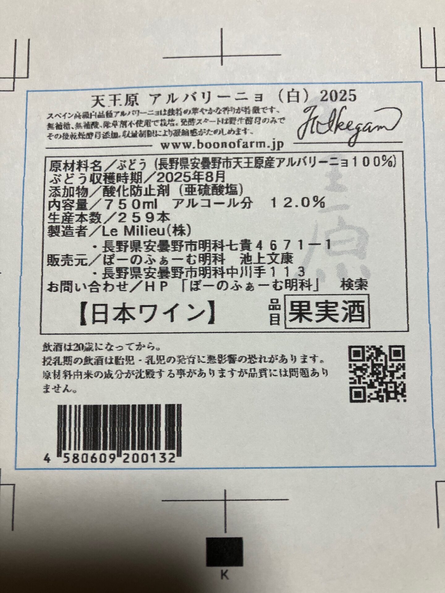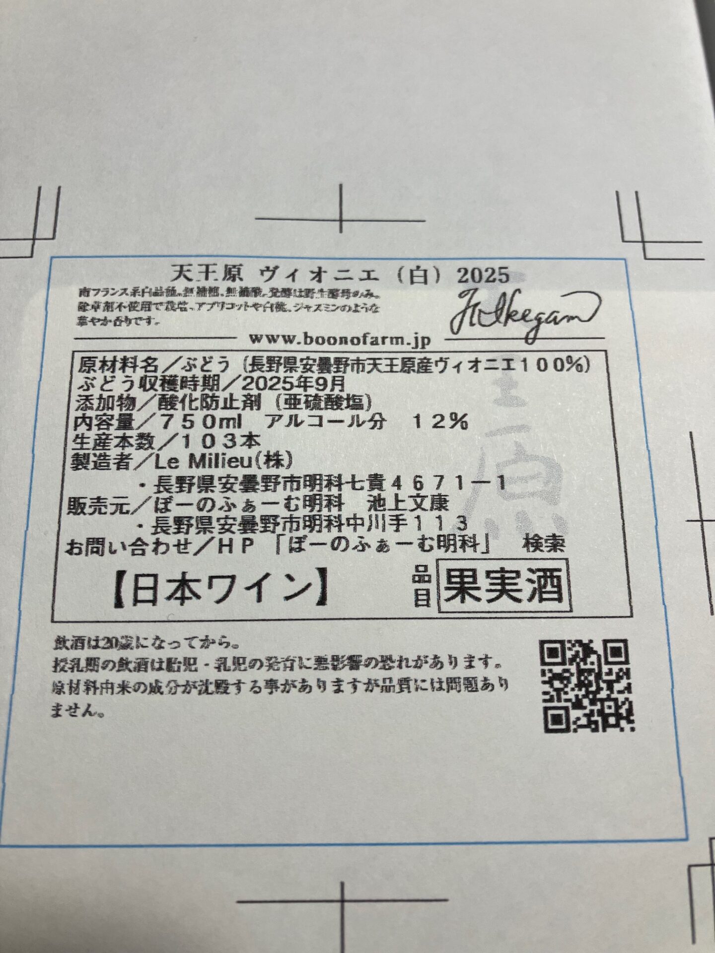 天王原アルバリーニョ2025は野生酵母のみの 山のアルバリーニョ といった感じで259本、天王原ヴィオニエ2025は南仏を思わせる感じがでていて面白く仕上がっていて103本。地ワインですので松本平中心に販売していく予定委です。